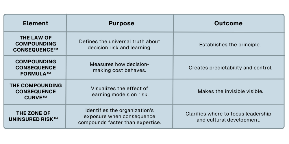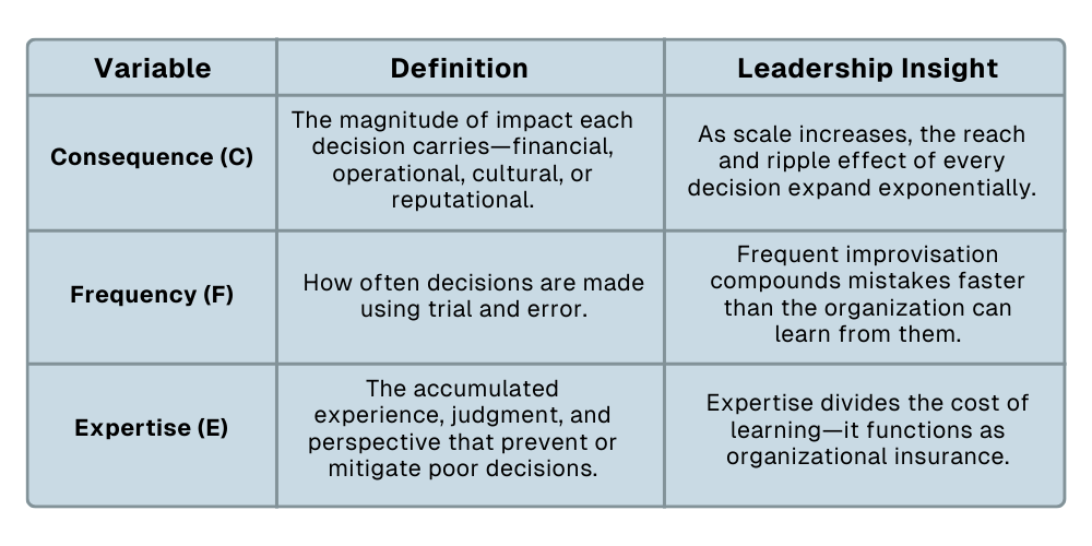 The Compounding Consequence Formula™ quantifies how decision risk behaves inside an organization. The formula shows that as Consequence and Frequency rise, learning costs and risk exposure increase unless Expertise compounds faster.